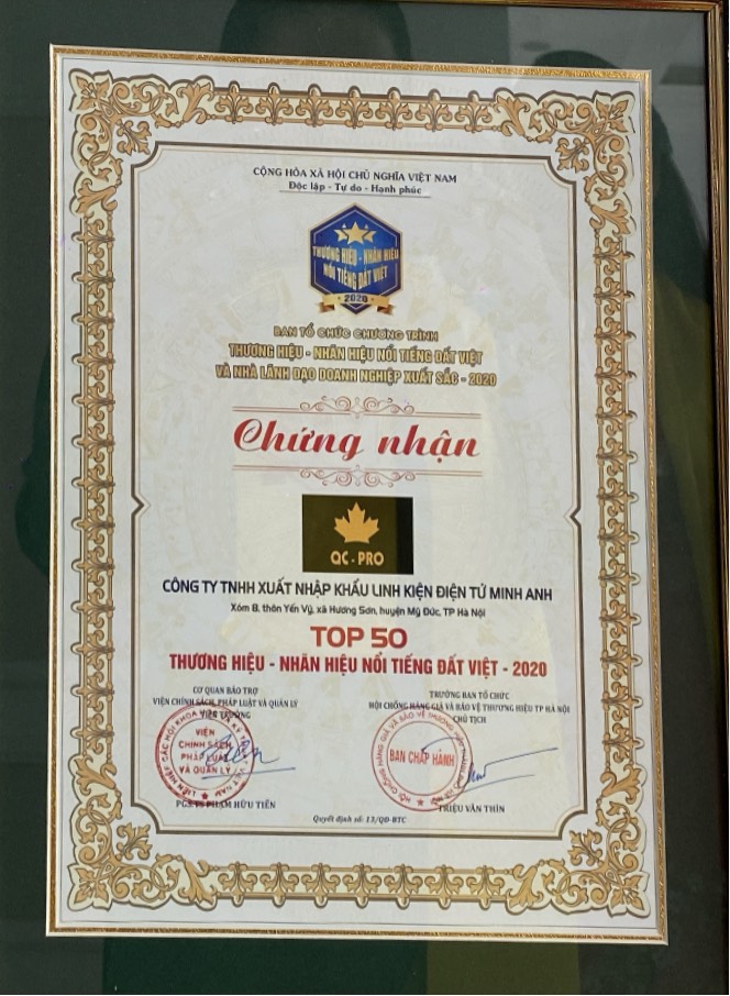 Trải qua quá trình đánh giá công tâm và khách quan của Hội đồng bình chọn gồm các chuyên gia hàng đầu từ các cơ quan, tổ chức bảo vệ người tiêu dùng, Công ty TNHH XNK LINH KIỆN ĐIỆN TỬ MINH ANH đã vượt qua hàng trăm hồ sơ trên cả nước để nhận danh hiệu “Top 50 Thương hiệu nổi tiếng Đất Việt 2020”, bên cạnh những tên tuổi lớn trên thị trường